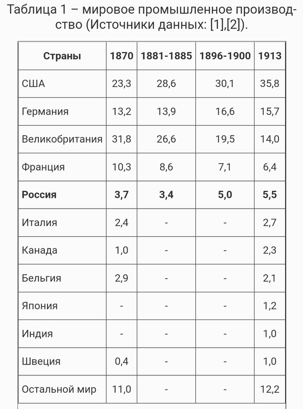 Так у Вас же в таблице всё видно: к 1913 рост доли промпроизводства был у двух стран: США и РИ, а у Англии, Франции, Германии началось падение.