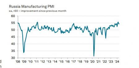 С учетом сезонных колебаний производственный индекс S&P Global в России Индекс менеджеров по закупкам™ (PMI) составил 54,4 в мае, что немного выше апрельских 54,3, что свидетельствует о резком улучшении