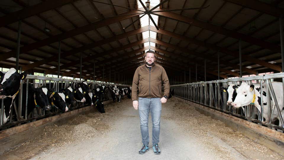 Фермер Штефан Блоттнер входит в хлев, но его взгляд устремлен не на коров, а на мобильный телефон в его руке.