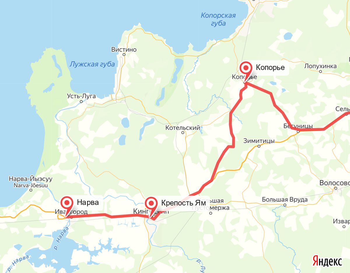 Так и есть, от Яма до Копорья примерно в два раза дальше. А вот от Ивангорода ни фига не в два раза дальше. От Нарвы до Ивангорода доплюнуть вроде нельзя, но... не факт, может и найдется плеватель, способный переплюнуть реку Нарва, которая собственно их разделяет. Как Буду и Пешт. Только Нарва пожиже Дуная будет. И да, жалко Пскова на карте нет, дабы маршрут Олеария к нему через Копорье стал очевиден. Ведь Псков - это Новгоро, ага?