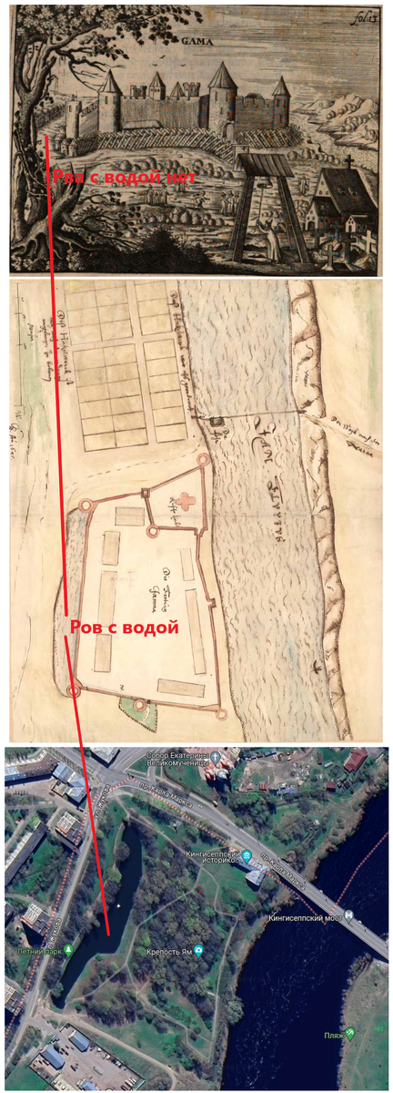 2. На гравюре Олеария отсутствует восточный ров с водой. На шведском чертеже 1645 года и реконструкции А.Н. Кирпичников восточный ров с водой присутствует. Присутствует восточный ров с водой на том же месте и сегодня.