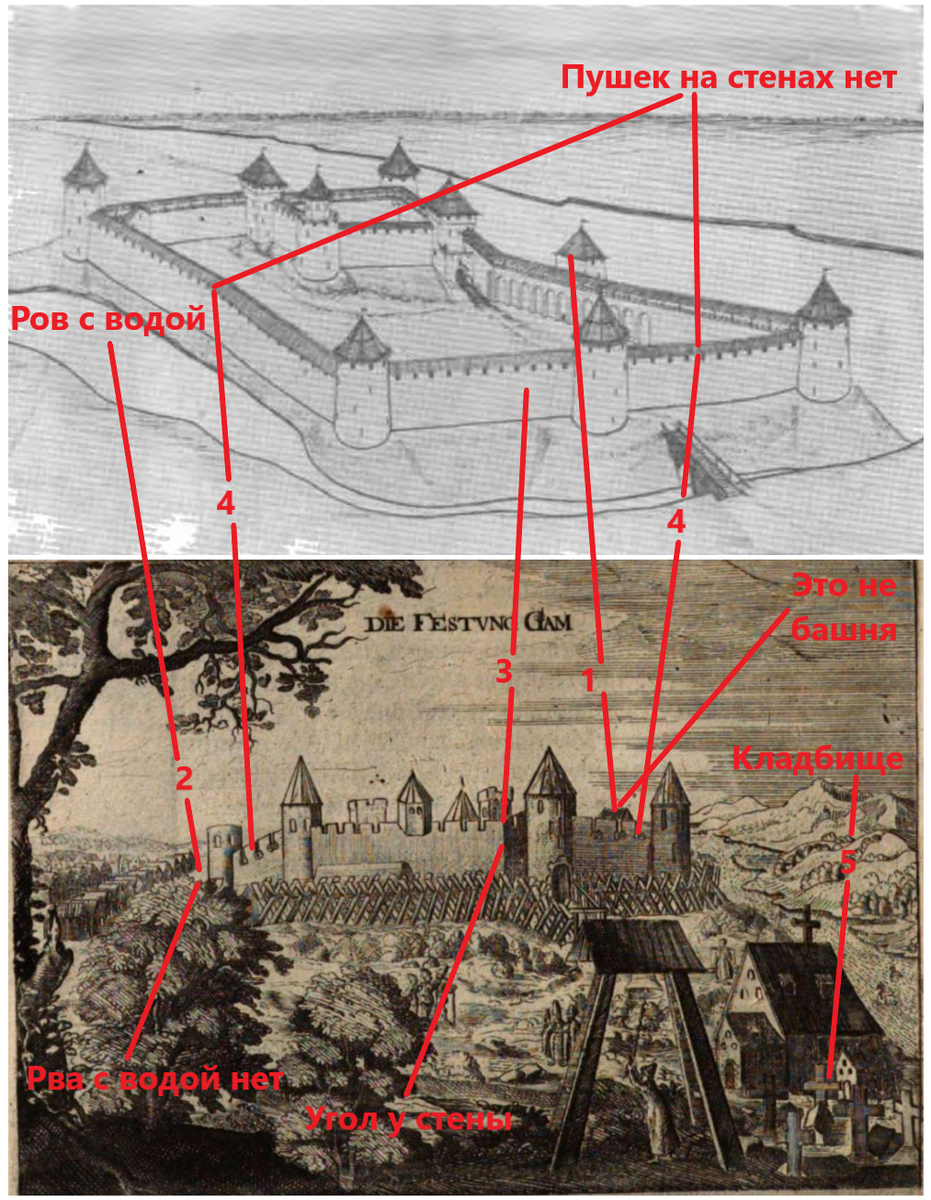 4. На гравюре на стенах крепости размещены пушки. В реконструкции их нет. Более того, А.Н. Кирпичников утверждает, что:
