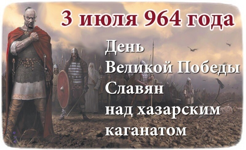 3 июля, в лето 965 г., великий русский князь Светослав Игоревич разгромил хазарскую армию и взял столицу Хазарского каганата — Итиль. Молниеносный удар русских дружин при поддержке союзных печенегов привёл к крушению паразитарного Хазарского государства. Русы свершили священную месть, уничтожив хазарского «змея». Блестящая военная победа Светослава укрепила юго-восточный фланг «империи Рюриковичей».
