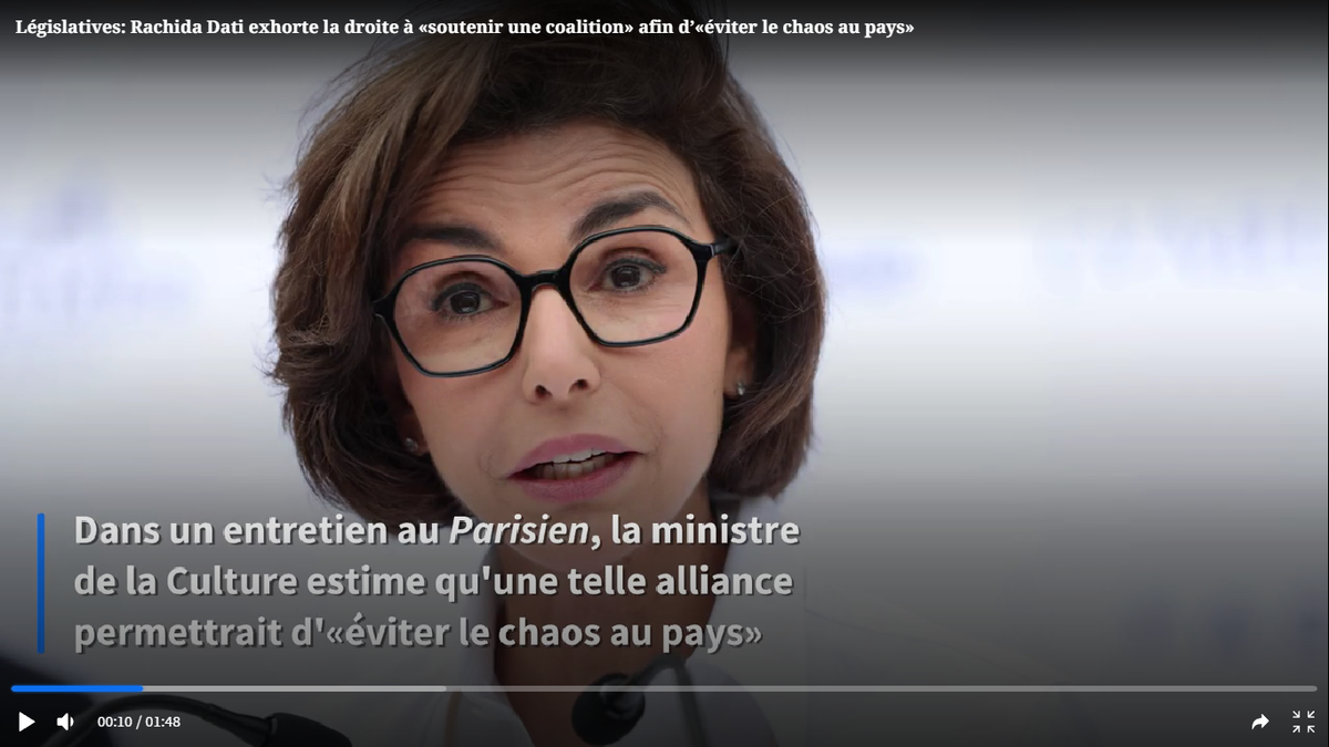 Вот уже и министр культуры французского правительства Рашида Дати в эфире изданию "Парижанин" "призывает к альянсу правых, чтобы избежать хаоса в стране".