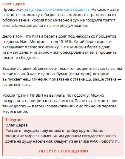 процентыобязательства по нему и структура. Иными словами тема, а чего стоит для граждан той или иной страны, тот или иной долг замылена полностью какой-то всевдо хренью, типа сравнения "долга" частногосударственного РФ с Люксембургом, допонительно по медиане. Т.е. логичный вывод тут - это за меньшие деньги россиян больше стригут и меньше кормят.Перспективный чат детектед! Сим повелеваю - внести запись в реестр самых обсуждаемых за последние 4 часа.