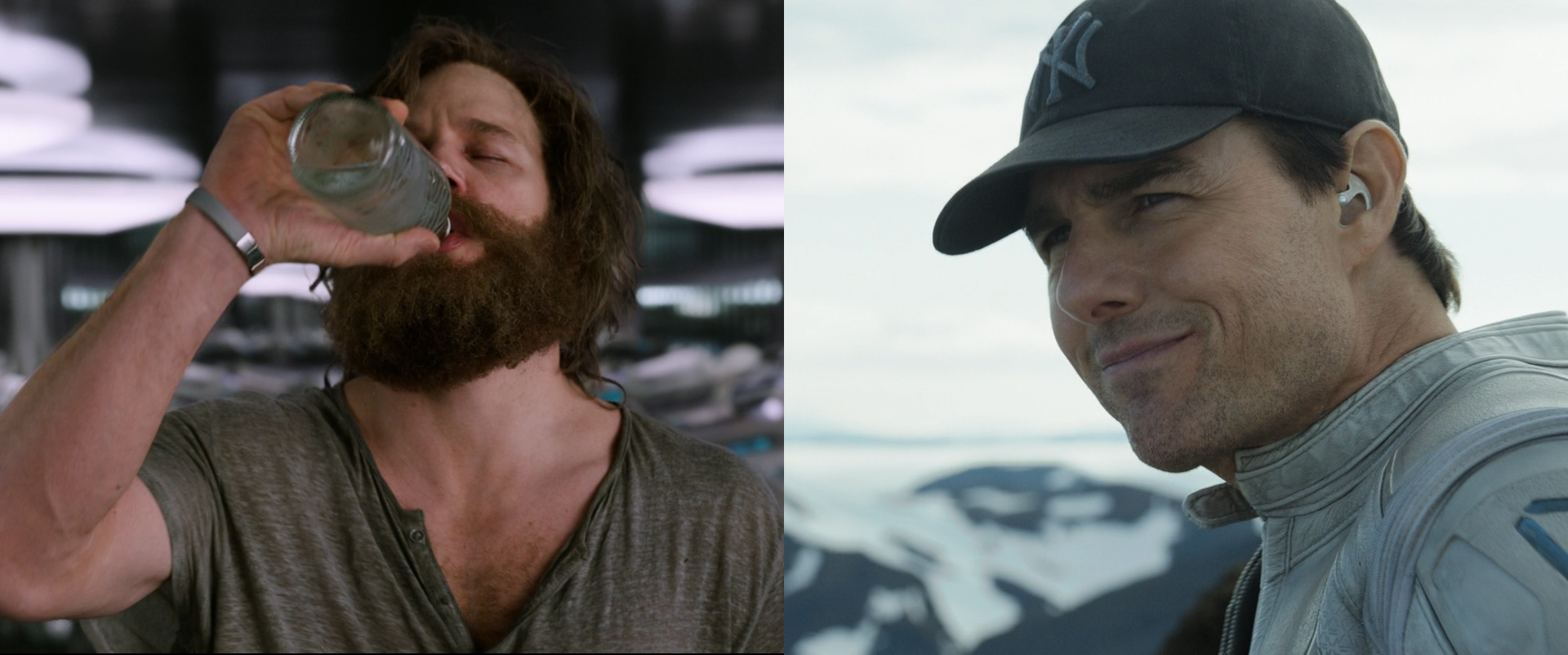 В фантастических фильмах «Обливион» и «Пассажиры» есть два похожих персонажа. Оба механики, оба отправляются в космическую экспедицию, оба в итоге спасают мир. Джек и Джим! Чьё имя лучше? «Произнеси их, — оба так же звучны». Но есть нюансы. Жизнь помещает их в совершенно разные обстоятельства. Джек, пусть и бессознательно, занимается уничтожением людской популяции, перед Джимом — наоборот стоит задача стать основателем новой колонии людей на новой планете. И реагируют они на эти обстоятельства тоже по-разному. Один в депрессии и выпивает. Второй наоборот — бодрячком.