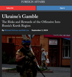 2 сентября Foreign Affairs: 6 августа Украина начала смелое наступление на Россию в Курской области, используя внезапность и скорость для быстрого обхода российских оборонительных рубежей. С тех пор Украина захватила часть российской территории и взяла в плен российских солдат. Сейчас, спустя три недели после нападения, украинские войска удерживают территорию и продолжают наступательные операции. Они, похоже, намерены укрепить защитный барьер внутри России.
