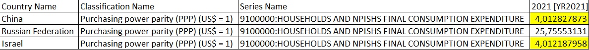 Я даже сначала подумал, что это клюк базы данных. Потребительский ППС валют Китая и Израиля до десятой совпал. Я подумал - технический глюк. Выгрузил (там есть возможность) в Excel. А там цифра выгружается несравнимо детальнее. Так вот оказалось, что не глюк. Расхождение проявляется лишь на 4-м (!) знаке.