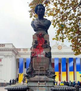 К ним политические украинцы питали особую ненависть. Что делают эти кацаповы идолы в украинськом мисте? Наезды не прекращались: пали Суворов, Екатерина, де Волан, Потемкин, Зубов. Уничтоженным памятным доскам русских и советских писателей, ученых, полководцев потерян счет. Но нет! Мало! Здесь русский дух, здесь Русью пахнет! Пушкин…