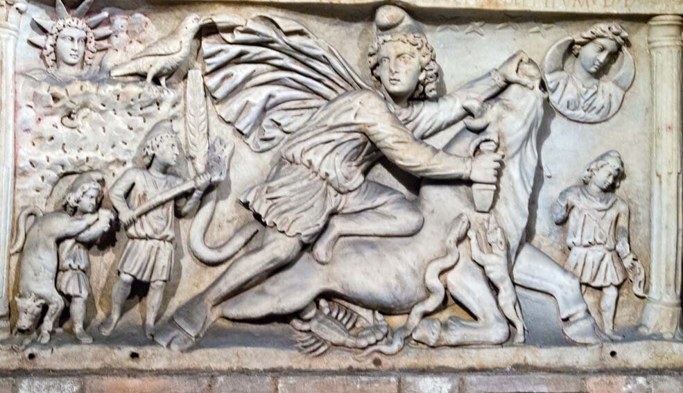 Вообще-то это персидская религия чуть ли не со времен Зороастра. Митра - божество Солнца и покровитель договоров. Римские легионеры потому и почитали его, что он наказывал тех, кто нарушал данное слово. Весьма не лишнее покровительство. Сейчас бы не помешало. Смысл представленной скульптуры тавроктонии (убийства быка) в митраизме - уничтожение предыдущей религии и захват накопленных ею ресурсов. Соответственно это переход от эпохи Тельца (4-6 тыс лет назад) к эпохе Овна (2-4 тыс лет назад).