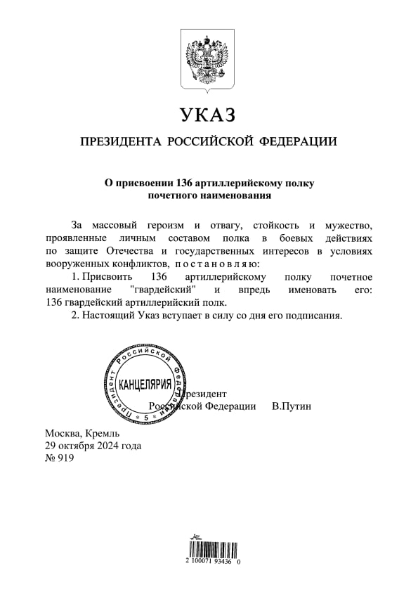 Владимир Путин подписал Указ «О присвоении 136 артиллерийскому полку почетного наименования».
