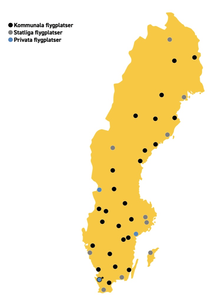 Всего в Швеции 10 государственных (Swedavia) и 32 региональных аэропорта. Три аэропорта находятся в частной собственности, один принадлежит частной компании совместно с муниципалитетом, шесть - в совместной собственности муниципалитета и региона, остальные - в муниципальной собственности.
