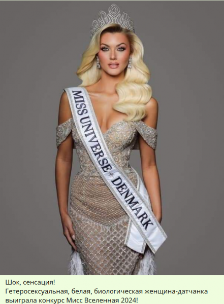СМИ: Скандал! ШОК-КОНТЕНТ! 21-летняя танцовщица Виктория Тельвиг из Дании выиграла конкурс красоты «Мисс Вселенная 2024», который в этом году проходил в Мехико. По какому-то недоразумению победительницей стала красивая, стройная, белая биологическая женщина. Говорят, она вдобавок еще из натуралов. Сама она утверждает, что происходит от древних викингов. Каково! Всему этому еще предстоит дать правовую оценку!