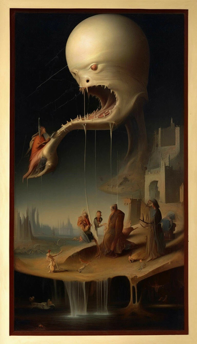 Картинки по мотивам известных художников. Шедеврум делает весьма недурные имитации, и простому зрителю это зайдёт, но стоит начать разбирать картину, как становится очевидным, что мы не можем извлечь из неё ни одной мысли, ни одной отсылки к реальности. При всей фантасмагории Босх чрезвычайно логичен и последователен, надо просто хорошо знать образы религиозной культуры, чтобы понять, на что он намекает в своих картинах, а ии всего лишь рисует тарабарщину в стиле Босха.