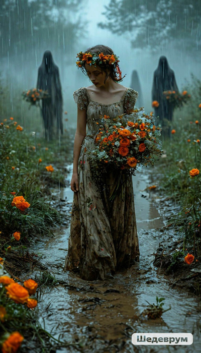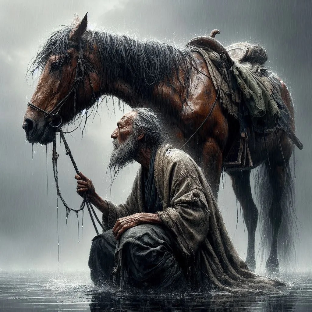 Обратный промт: (Психически больной дед сидит на табуретке в луже и держит за узду святого коня, который ходит по воде и думает, что за идиот сидит на табуретке в луже.)