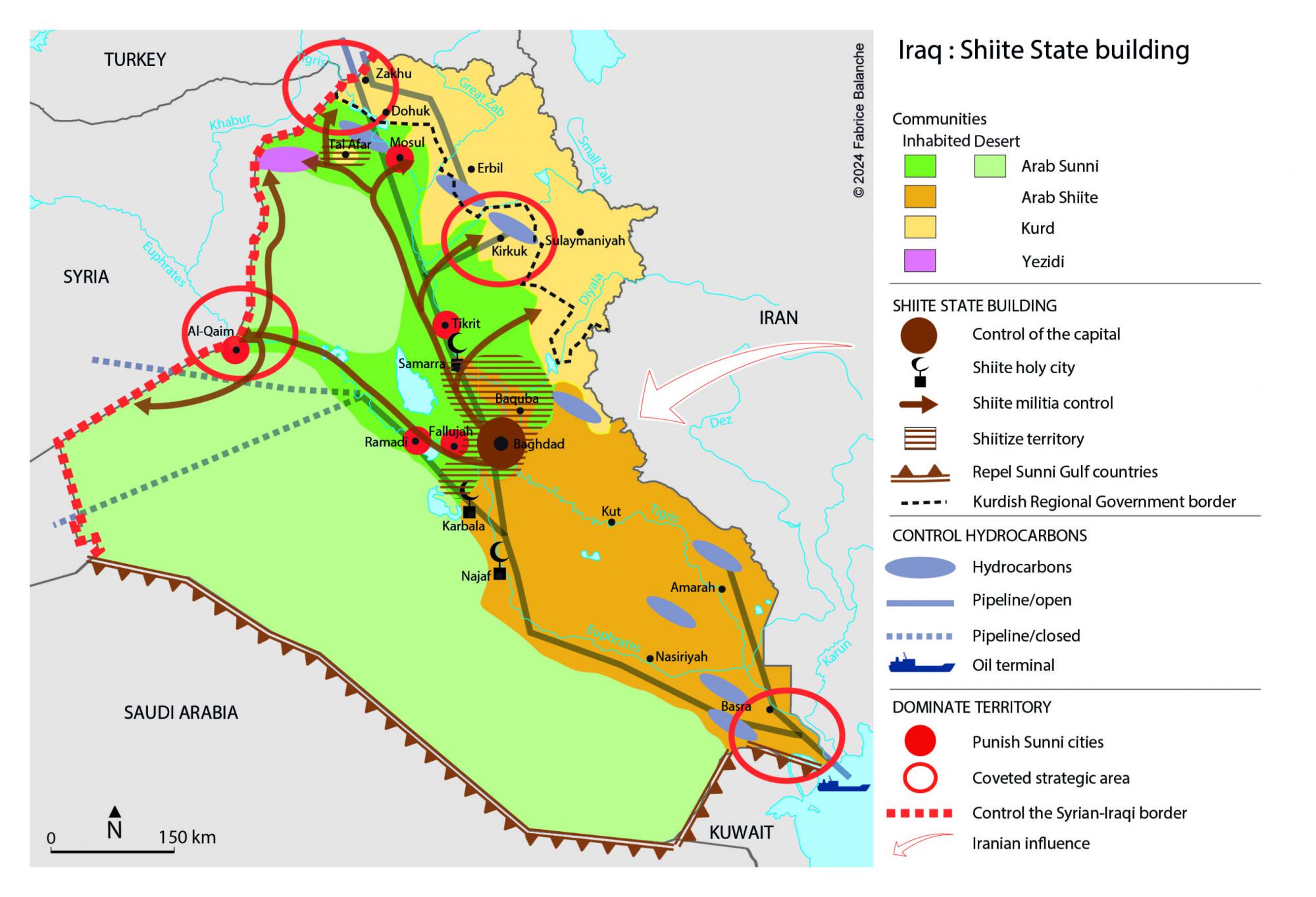 Этническая карта Ирака. Шииты занимают примерно половину обитаемого Ирака: от Басры до Багдада, зеленым отмечены суннитские районы, а на северо-востоке видна область занимаемая курдами. Источник https://www.fabricebalanche.com/en/iraq/deciphering-of-the-political-and-security-perspectives-in-iraq/