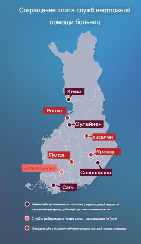 В Кеми, Савонлинне, Оулайнене и Сало прекратится ночное дежурство специализированной больничной помощи и необходимые для этого операции. В Валкеакоски не удалось возобновить работу круглосуточной службы экстренной помощи.