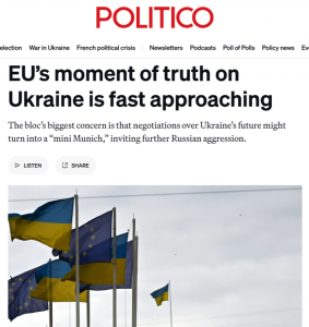 Наибольшее беспокойство блока вызывает то, что переговоры о будущем Украины могут превратиться в «мини-Мюнхен». Это повлечет за собой не только немедленные территориальные потери для Украины, но и создает риск дальнейшего продвижения России на востоке страны, большой волны украинских беженцев в ЕС и умиротворяющего настроя, который исключит членство Киева в НАТО и, возможно, поставит под угрозу его стремление вступить в ЕС.