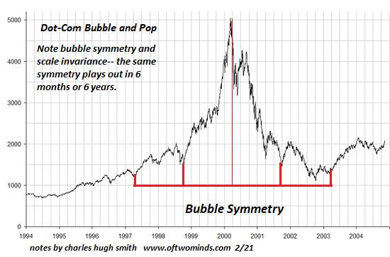 3. Пузыри на рынке активов концентрируют вновь обретённое богатство в руках 10% самых богатых людей, усугубляя неравенство в доходах и вынуждая тех, кто остался позади, играть в азартные игры во всё более спекулятивном финансовом секторе, поскольку это единственное доступное средство для продвижения вперёд. Спекуляция также является самоликвидирующейся системой, поскольку рискованные ставки в конечном итоге оборачиваются убытками, которые запускают самоподдерживающуюся обратную связь: продажа активов для получения наличных средств, что приводит к снижению цен, что, в свою очередь, приводит к ещё большей продаже активов и так далее.