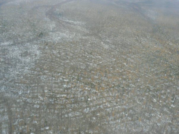 Тут квадратиками лес расчерчен, причем сам так растет и так не в одном месте. Ни выработок, ни каких то дорог рядом нет. Лес пилили ближе к Ангаре, там целая сеть узкоколейных железных дорог, километров по 30 длиной, для вывоза на берег, построенная еще при царях и активно действовавшая при гулаге. Сейчас все заброшены.