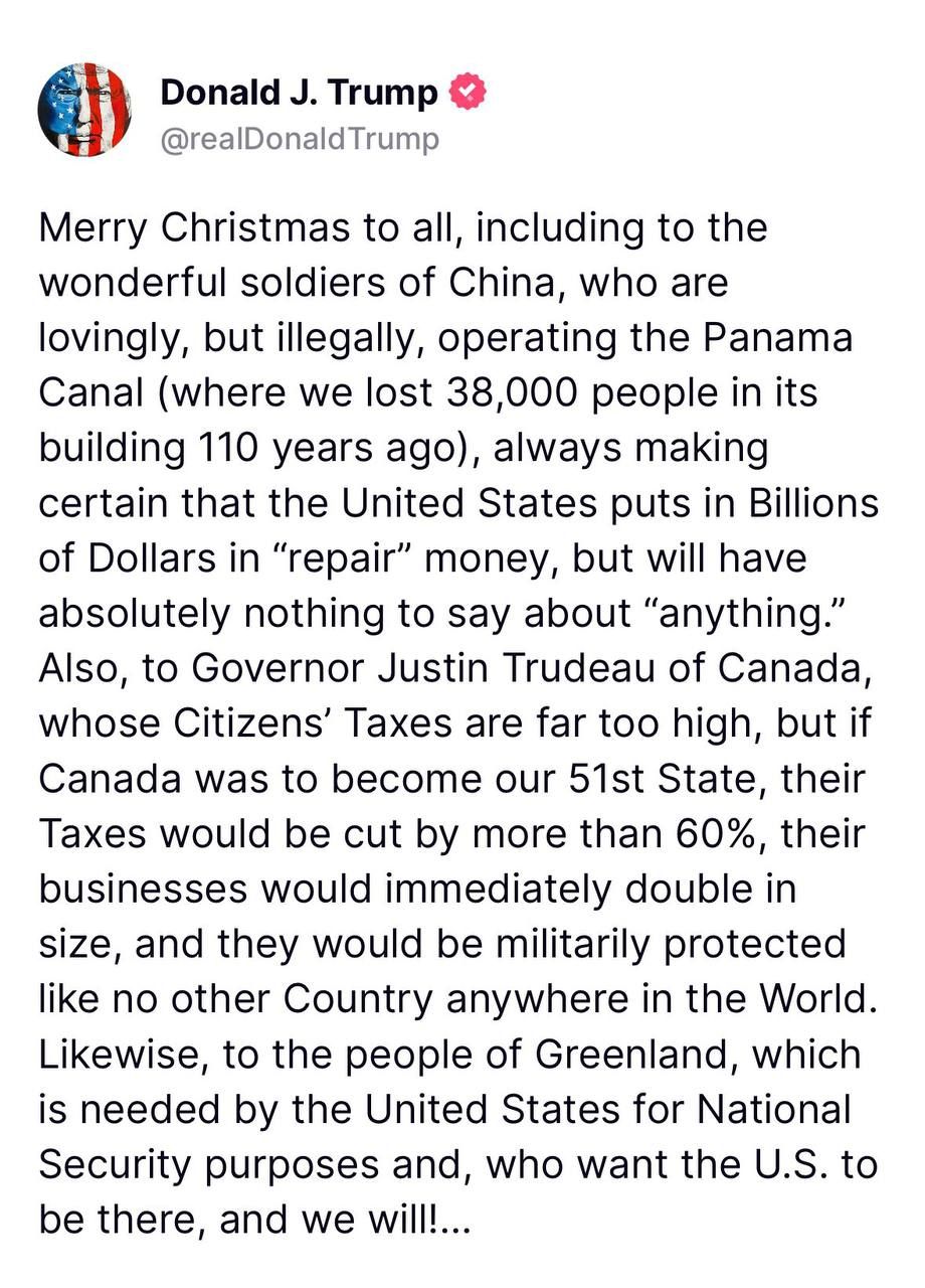 Трамп — поздравил с Рождеством будущий 51-й штат Канаду и пообещал народу Гренландии американское присутствие: Счастливого Рождества всем, включая замечательных солдат Китая, которые с любовью, но незаконно, эксплуатируют Панамский канал (где мы потеряли 38 000 человек при его строительстве 110 лет назад), всегда следя за тем, чтобы Соединенные Штаты вкладывали миллиарды долларов в «ремонт», но имеют абсолютно никакого права голоса.