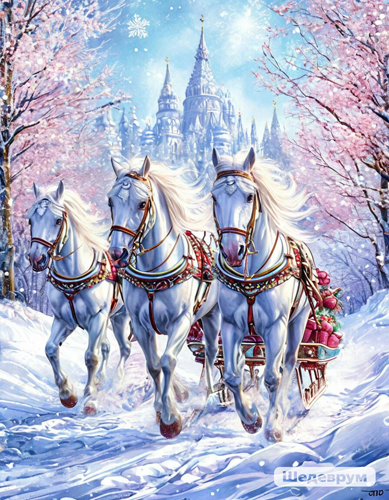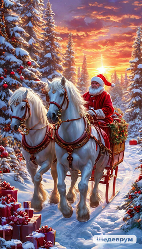 А почему Дед Мороз в красном сантаклаусовском колпаке? Гибрид? И не на тройке лошадей а на паре? С оленями попутал?