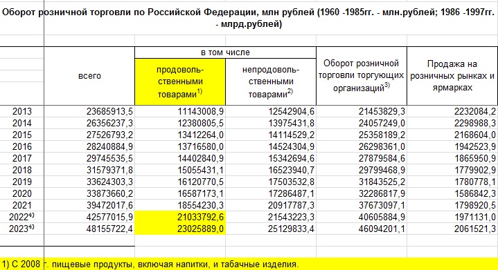 В прошлом, 2023 году, россияне потратили на продовольственные товары 23 (а не 2 !!!) триллиона рублей. Это - не считая оборота общественного питания (хотя там тоже едят)