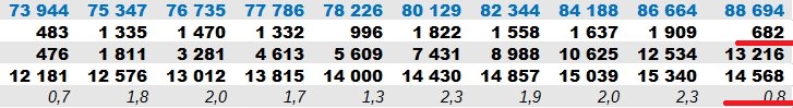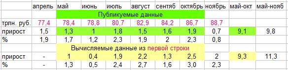 Однако же натуральные цифры кредитования совершенно не соответствуют оценкам, выдаваемом в тексте ЦБ РФ. Пройдёмся по предыдущим выпускам данного обзора в течение полугода и сведём данные о корпоративном кредитовании в табличку, отталкиваясь от показателя "Объём портфеля", который в ноябре достиг значения 88,7 трлн. руб.