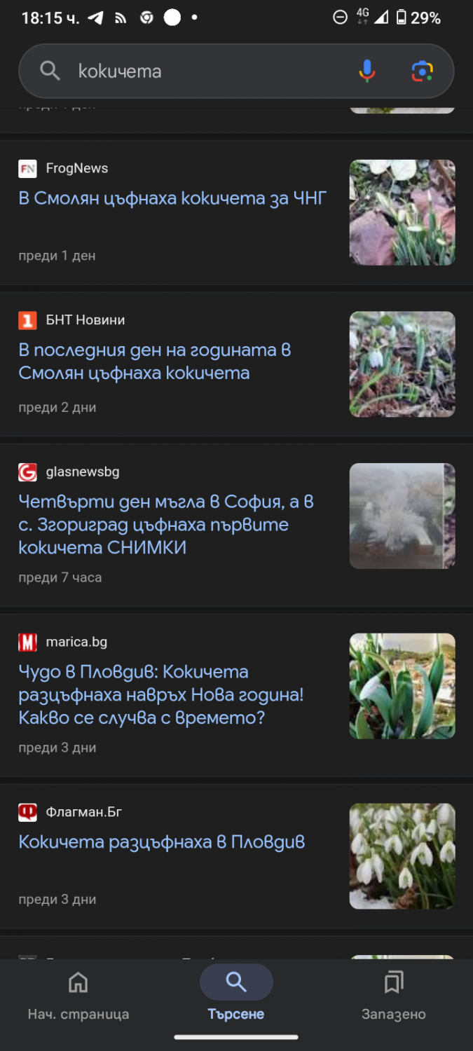 Сегодня время было хорошо , где-то 10-12 градусов в тени, на солнце больше . Ну я занялся чистить во дворе, старые листья , камни, трава и вот когда то очередные листья собирал и вот под них открылись подснежники, где-то 2-3, даже 4 см. над землёй прорастали, и тогда подумал - ну вот листья замедлили их развитие, а можно где то на солнце уже расцвели и вечером поискал в болгарскому интернете и правда, подснежники на солнце массово расцветали , повсюду в Болгарии , на фото сделал скриншот !