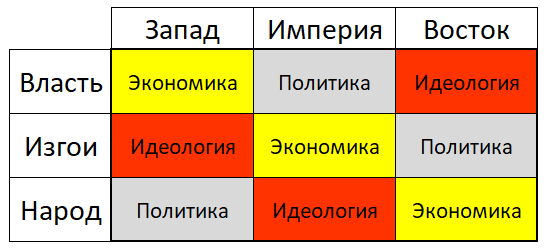 В основе первой теории лежит учение о трех ритмах, выбравших один из трех приоритетов: экономика, идеология и политика. Экономическому ритму было присвоено имя ЗАПАД, идеологическому ритму дали имя ВОСТОК, ну а политический ритм - это ИМПЕРИЯ.