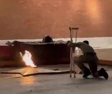 По сети разошлось видео с российским бойцом, который на костылях возлагает цветы и преклоняет колено перед Вечным огнём у Кремлёвской стены в Москве.