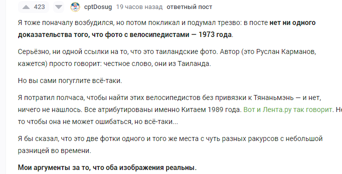 Одна из классических "стандартных" фотографий "зверств на Тяньаньмэнь", когда танки равнодушно едут мимо скинутых к краю дороги трупов с велосипедами, оказалась, благодаря технологичному поиску по частям картинки, отредактированным коллажем с использованием фотографий студенческих протестов в Таиланде 1973 года.