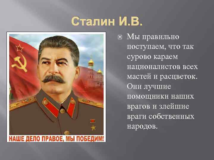 «Нет, мы правильно поступаем, что так сурово караем националистов всех мастей и расцветок. Они лучшие помощники наших врагов и злейшие враги собственных народов. Ведь заветная мечта националистов – раздробить Советский Союз на отдельные “национальные” государства, и тогда он станет легкой добычей врагов. Народы же, населяющие Советский Союз, в своем большинстве будут физически истреблены, оставшаяся же часть превратится в бессловесных и жалких рабов завоевателей.