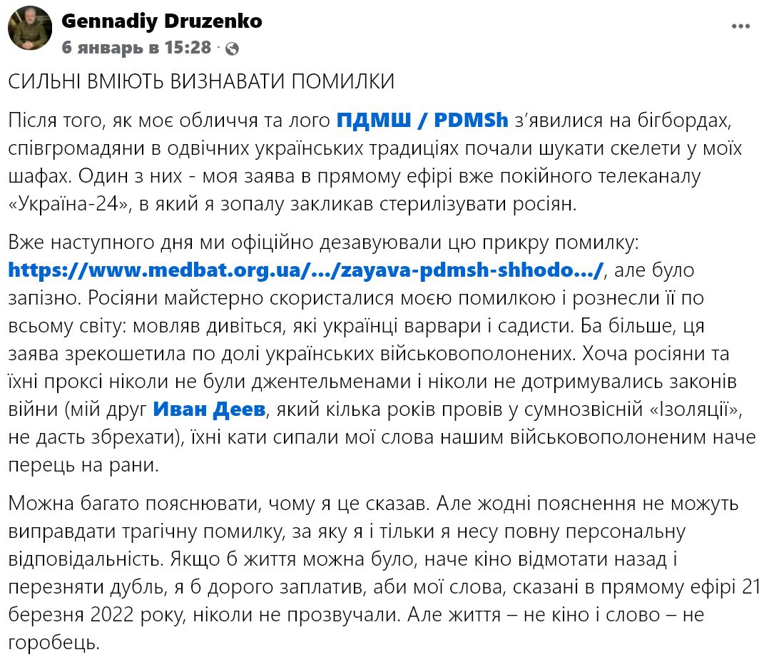 Весной 2022 года «военврач» Геннадий Друзенко (в реальности у него нет медобразования), выступая в эфире канала Украина-24, объявил, что дал указания своим подчиненным кастрировать пленных русских солдат, «потому что это тараканы, а не люди». При этом себя он назвал гуманистом, «но времена изменились».
