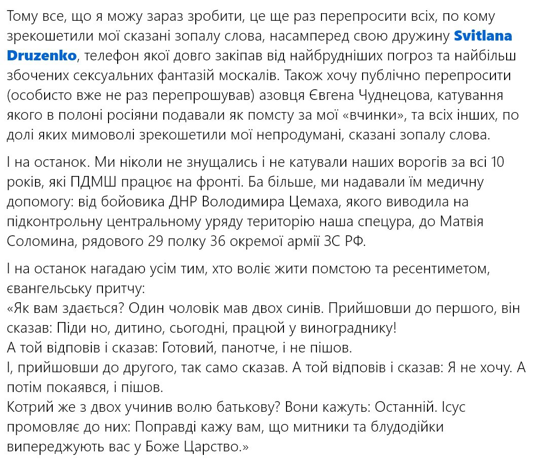ПРочитайте еще раз! Он покаялся перед женой, побратымами и азовцами, которым его слова вышли боком.