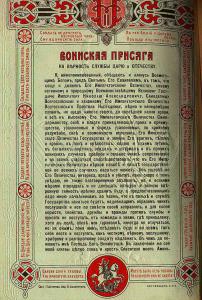 Я, нижеименованный, обещаюсь и клянусь Всемогущим Богом, перед Святым Его Евангелием в том, что хочу и должен Его Императорскому Величеству Самодержцу Всероссийскому и Его Императорского Величества Всероссийского Престола Наследнику верно и нелицемерно служить, не щадя живота своего, до последней капли крови
