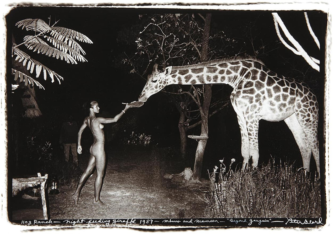 В нашу последнюю ночь на ранчо Хог, около 2:30 утра, мы сидели у костра, ожидая, когда отправимся в аэропорт и уедем из Кении, я чувствовала себя очень тяжело. Мы ждали жирафов для снимка, который стал бы Night Feeder, но они уже очень давно не приходили поесть, и мы думали, что упустили свой шанс. Внезапно жираф вошел в лагерь, Питер спокойно сказал: «Вот и все, ребята. Морин, приготовьтесь». Мое сердце готово было выпрыгнуть из груди. Я бросилась снимать с себя все и отчаянно пыталась балансировать на цыпочках, чтобы удержать миску с кормом. Я была напугана и благоговела перед этим возвышающимся зверем. Я никогда не чувствовала себя так натуралистично. Было холодно, и я была голой. Это было потрясающе. Затем, почти сразу же, мы сели в машину и стали прощаться". На снимке модель Морин Галлахер кормит ночью жирафа, «Ранчо Хог», Найроби, Кения, 1987 год. фотограф Питер Бирд
