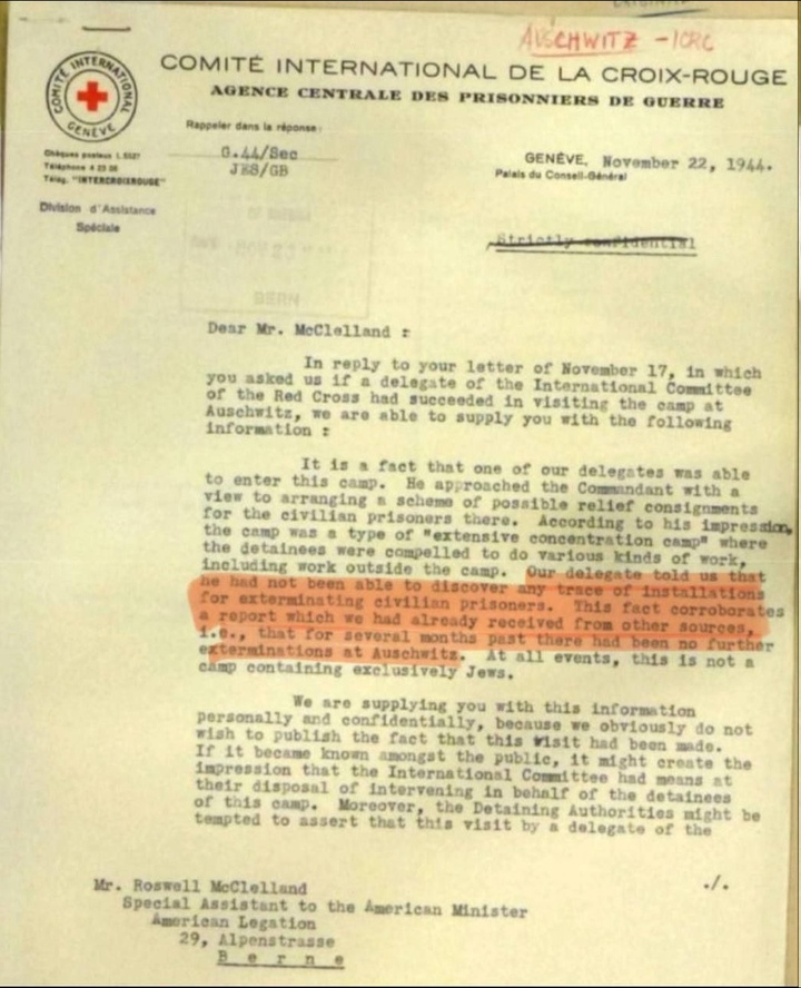 Примечательно, что эти сведения соответствуют инспекционным документам швейцарского Красного Креста, которые сегодня принято считать недостоверными, так как представителям Красного Креста не разрешалось видеть никаких доказательств уничтожения людей в Освенциме. Красный Крест с тех пор извинился за то, что не смог рассказать об этом лагере то, что там было убито около миллиона человек, в основном евреев.