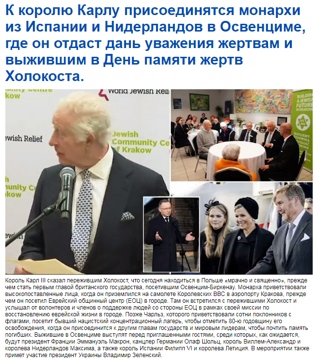 Английское издание пишет: "Король отправился в Польшу, чтобы отметить это знаменательное событие, пригласив иностранных монархов, президентов, премьер-министров и людей, переживших Холокост, на службу в музей и мемориал Аушвиц-Биркенау." И они там, что б отметить отметить «80-ю годовщину победы Великобритании и ее союзников над нацистами и прекращения Холокоста". Приватизация Победы уже произошла, теперь это победа Великобритании... И союзников. Без СССР, но с нацистом Зеленским, который сейчас на Украине сносит памятники советской армии.