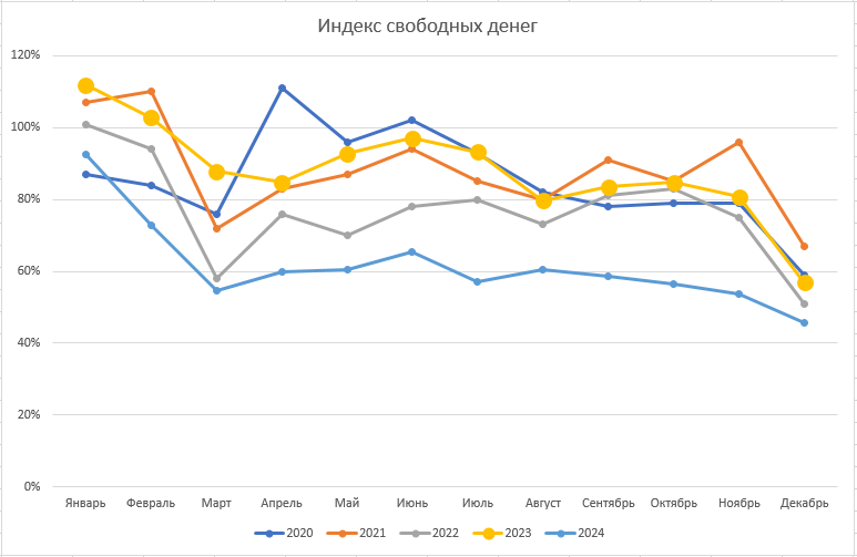 Вывод: 2022й был хуже предыдущих, 2023й начался лучше 2022го, но к концу года припал к 2022му, 2024й - худший за 5 лет, видно, как народ безудержно "богатеет" на фоне высокой инфляции. Дальше будет хуже. Главный вопрос - улучшится ли ситуация, если полностью запретить аборты и сатанизм, а количество уроков "разговоры о важном" увеличить в 2 раза?