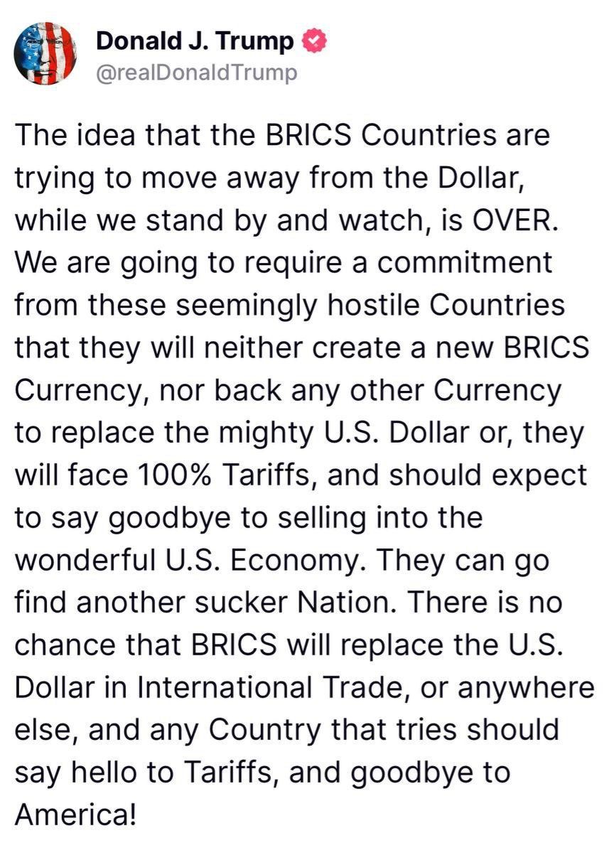 Мы потребуем от этих, по всей видимости, враждебных стран, чтобы они не создавали новую валюту БРИКС и не поддерживали любую другую валюту для замены могучего американского доллара, в противном случае им придется столкнуться со 100-процентными тарифами и попрощаться с возможностью продавать свои товары на великолепном американском рынке.