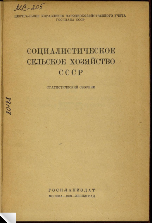Социалистическое сельское хозяйство СССР : статистический сборник / Центр. Упр. Народохоз. Учета Госплана СССР. - Москва ; Ленинград : Госпланиздат, 1939. - 128 с. - Загл. обл. : Социалистическое сельское хозяйство Союза ССР.