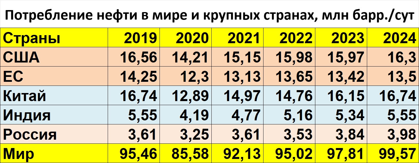 Данные таблицы 1 показывают, сколь серьёзным оказался ковидный кризис. Никогда ранее мировое потребление нефти не снижалось за год на 10,3%. Но уже в 2022 г. Китай и Индия наверстали потерянное. США и ЕС на докризисные уровни так до сих пор и не вышли, а Россия вместе с остальным миром потребление увеличила.