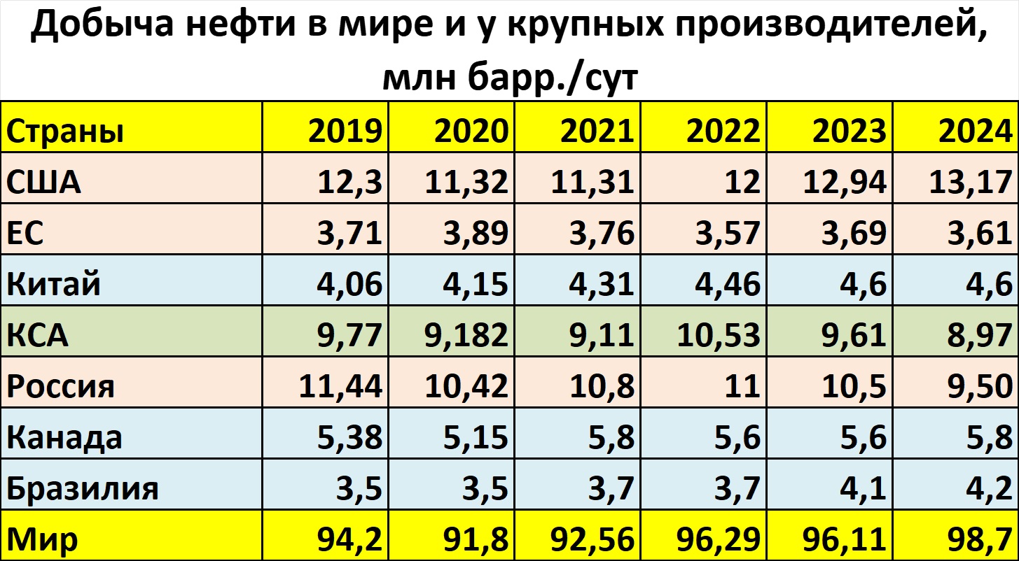 Нужно отметить, что Канада, Бразилия и даже Китай за 5 лет прибавили по 0,5 млн барр./сут, а Россия и КСА сократились на 1,5 млн барр./сут. Что тому причиной, договорённость в рамках ОПЕК+ или истощение пластов, судить не берусь. У нас, разумеется, сказались трудности с отгрузкой морем. А у саудовцев максимум (10,6 млн барр./сут) наблюдался в 2006 году и, похоже, уже никогда не будет превышен.
