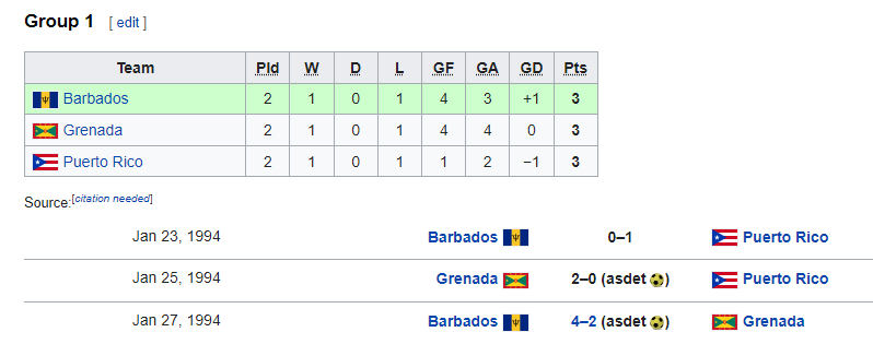 В квалификации команды проводили однокруговой турнир в группе из трёх команд. В первых двух играх Барбадос уступил Пуэрто-Рико 0:1, а Гренада обыграла пуэрториканцев 2:0. В последнем туре барбадосцам нужна была победа, причём с разницей в два мяча, чтобы занять первое место в группе и попасть в финальный этап турнира.