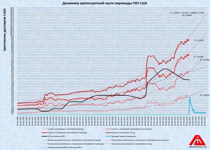Как показывали ранее, доходы бюджета США в номинале (без учета инфляции) растут на многолетнем интервале примерно в 10 раз медленнее, чем растет краткосрочная часть пирамиды ГКО. Нынешний рост процентных выплат, конечно, внесет свою лепту в ускорение процесса.