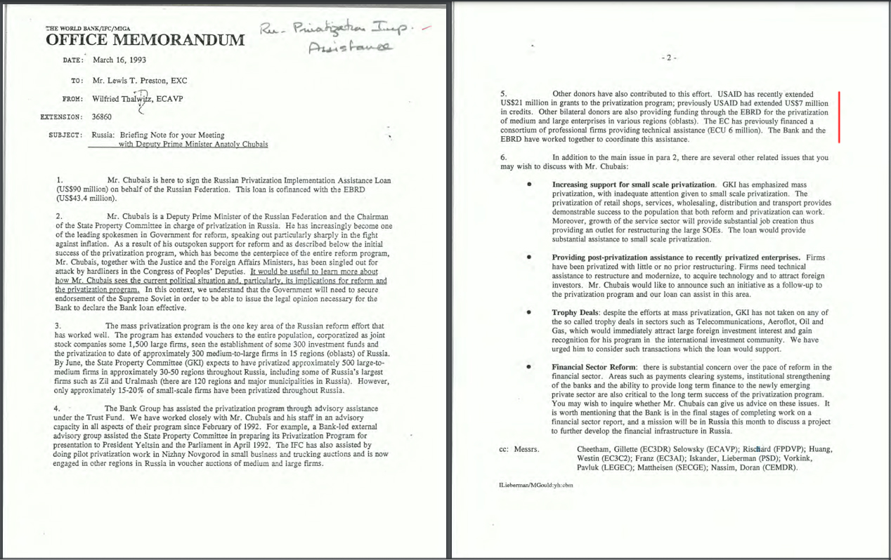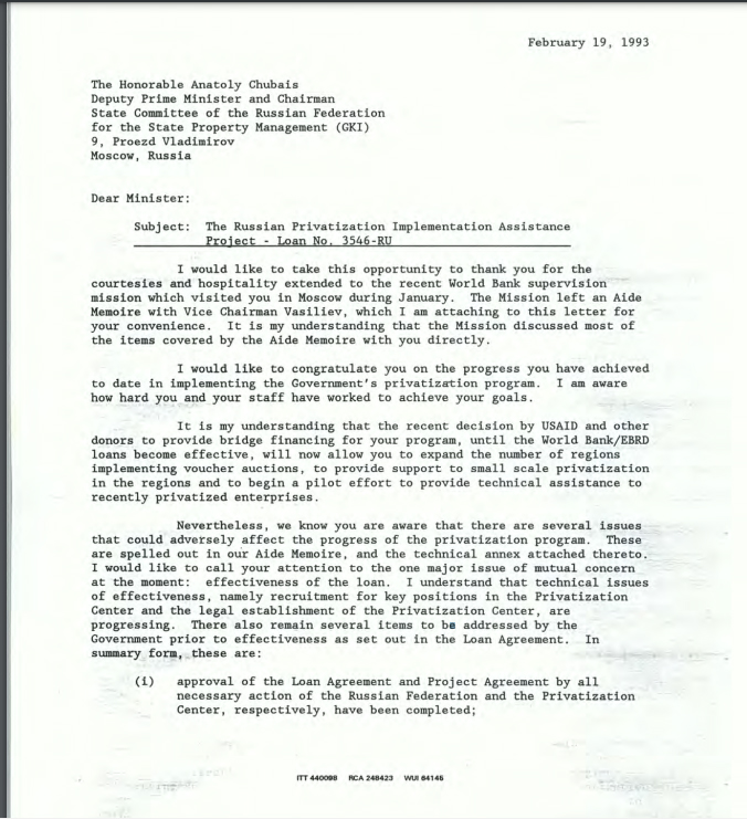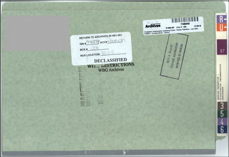 В 2014 году Мировой Банк опубликовал папочку под названием: "Проект содействия реализации приватизации - Российская Федерация - Кредит 3546 - P008810 -Переписка - Том 7 (1 декабря 1992 г. - 30 марта 1993 г.) " Из архива Группы Всемирного банка, Вашингтон, округ Колумбия, США.