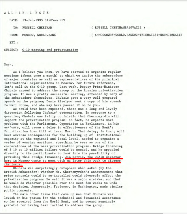 На стр. 167 можно узнать время появления помощи USAID. Группа Мирового банка в Москве стали устривать встречи для продвижения приватизации РФ с послами некоторых стран и назвали эти встречи G-10. Чубайс выступил на такой встрече, где поведал, что Черномырдин за приватизацию, а проблемы стоит ждать от парламента. И потому кредит от ВБ может взят не вовремя и время до него нужны ещё вливания, чтоб не останавливаться с приватизацией. Он назвал цифру 10-15 млн и попросил присутствующих помочь с этим: