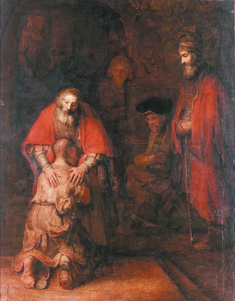 1.Внимание исследователей приковывает фигура последнего свидетеля, расположенная в правой части картины. Она играет важную роль в композиции и написана почти так же ярко, как основные действующие лица. Его лицо выражает сочувствие, а надетый на него дорожный плащ и посох в руках наводят на мысль, что это, также как и блудный сын, одинокий странник. Израильская исследовательница Галина Любан[4] считает, что этот образ связан с фигурой Вечного Жида