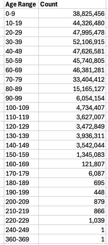 Согласно таблице, среди получателей пособий в США есть не только несколько миллионов живых американцев в возрасте 120−249 лет, но также один «долгожитель», отнесенный к возрастной группе 360−369 лет.